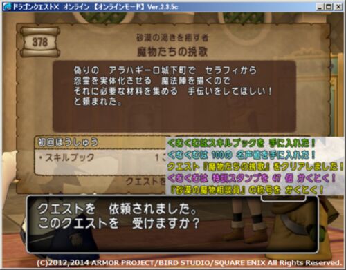 http://hiroba.dqx.jp/sc/topics/detail/99bcfcd754a98ce89cb86f73acc04645/ >「砂漠の渇きを癒す者」 全3話 ってことで、偽りのアラハギーロの外伝クエストが昨日の正午から配信開始しました。 クエストの流れは、今回は省きますね。 ↓報酬だけ書くとこん…
