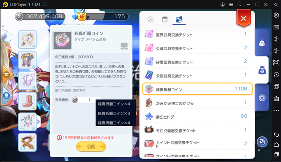 「純真祈願コイン」は雑魚敵を撃破で貰えて、1日200個まで入手可能。