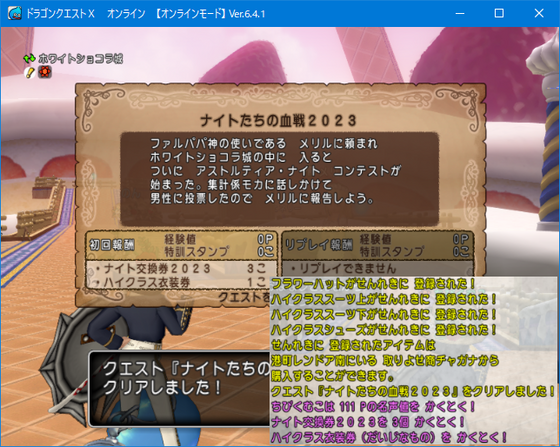 投票エリアに行って出場者の発表と投票→クエストクリアの流れです。