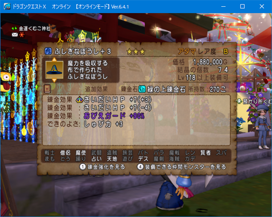 新調するならHPを高めたいなあと思っていたので、HP錬金帽子にしました。