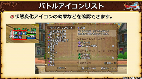 バトル中のバフデバフ・状態異常のアイコンの各効果の詳細が見れる。