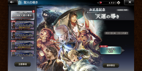 お正月記念「天運の導き」は、無料で10連が3回引けます。
