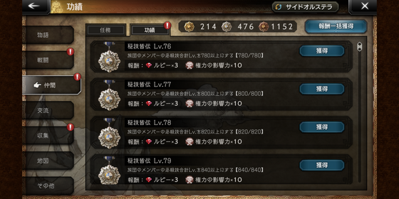 必殺技のレベル上げに関しても、合計数に応じて功績が用意されているので