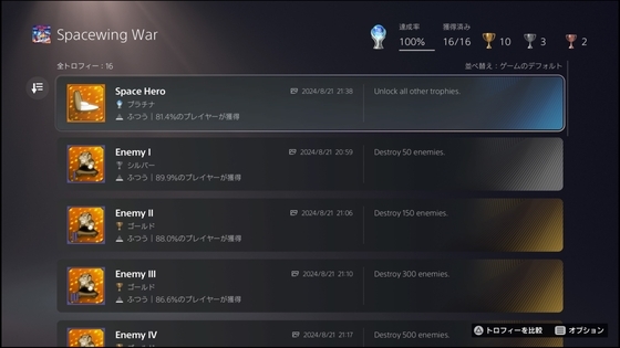 トロフィーに関しては、プラチナまで用意されています。
