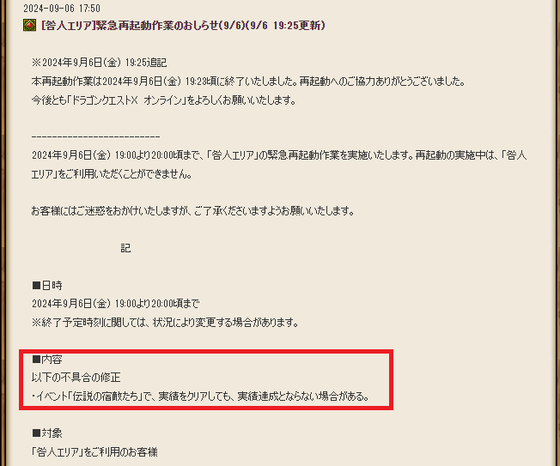 >[咎人エリア]緊急再起動作業のおしらせ(9/6)