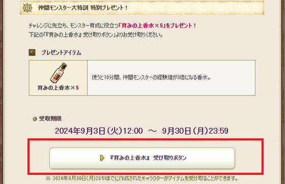 公式ページにて「育みの上香水」が5個、全キャラ貰えるので